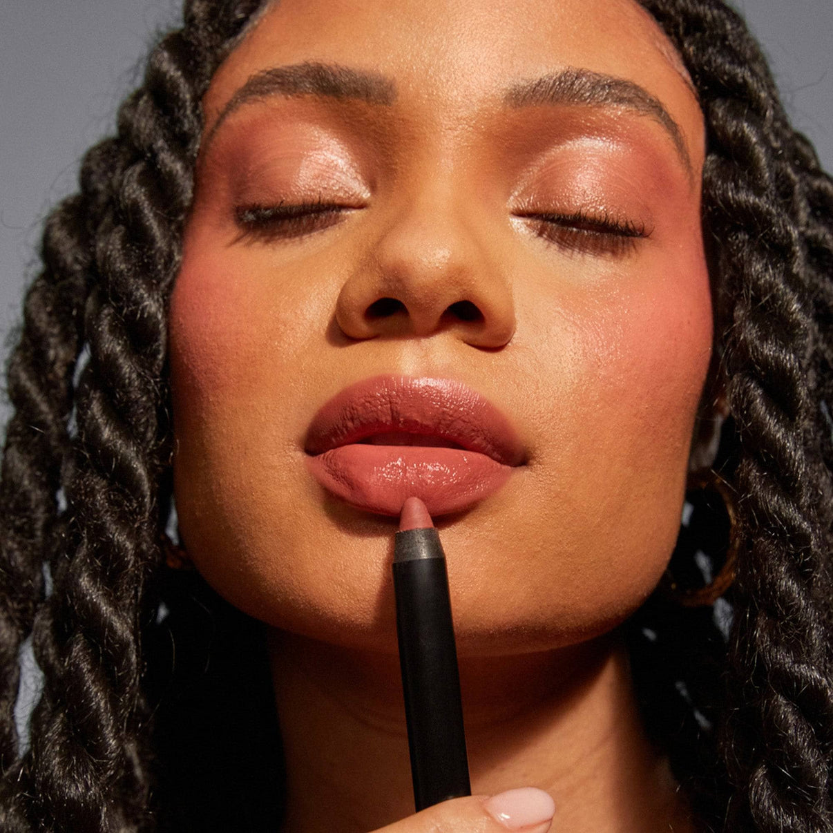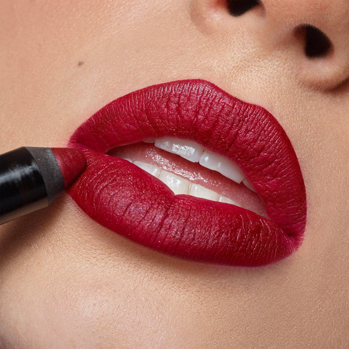 Outline your lips with the INTENSE LIP + CHEEK MATTE LIPSTICK PENCIL and then fill in your lips, smacking them together to ensure even coverage.