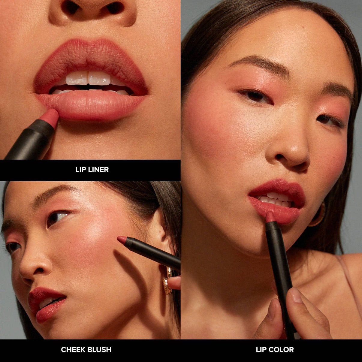 - Three-in-one matte lipstick pencil, lip liner and cheek tint.