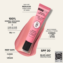 Multi-tasking liquid blush tint with SPF 30 for cheeks, eyes, and lips. Delivers fresh, soft color while protecting against UVA/UVB rays, blue light, and environmental stressors. Clean, vegan, reef-safe formula made with 100% mineral non-nano zinc oxide.